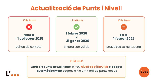 Per exemple, l’1 de febrer de 2026 el nivell de L’illa Club s’adaptarà al volum de punts acumulats durant: